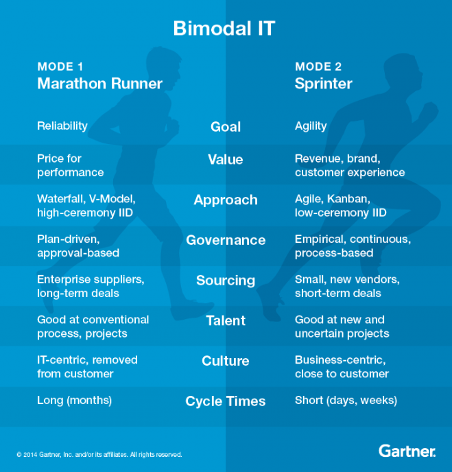 ガートナーは、2017年までにIT組織の75%がバイモーダルの機能を持つがそのうち半数は混乱してしまう、と予測しています。