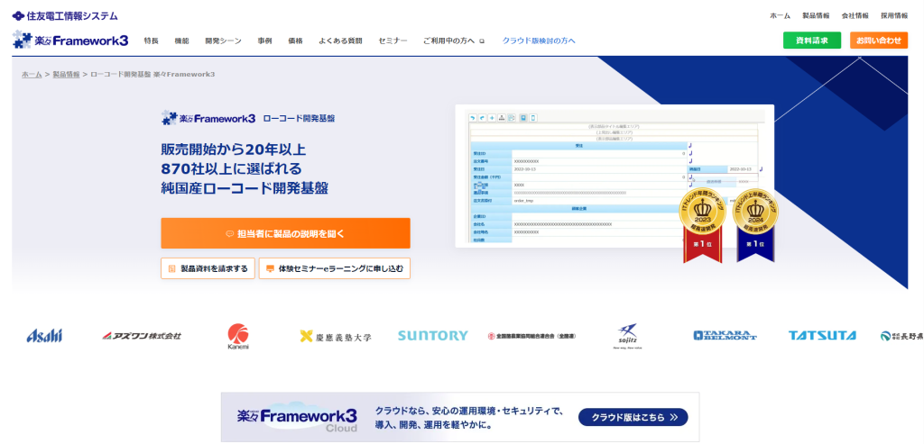 楽々Framework3は、部品組み立て型の純国産ローコード開発プラットフォームです。チームの情報共有ツールから企業の基幹系システムまで幅広い開発に対応しています。