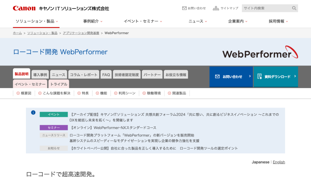 WebPerformerは、キヤノンITソリューソンズ株式会社が提供する、純国産の自動生成型ローコード開発プラットフォームです。