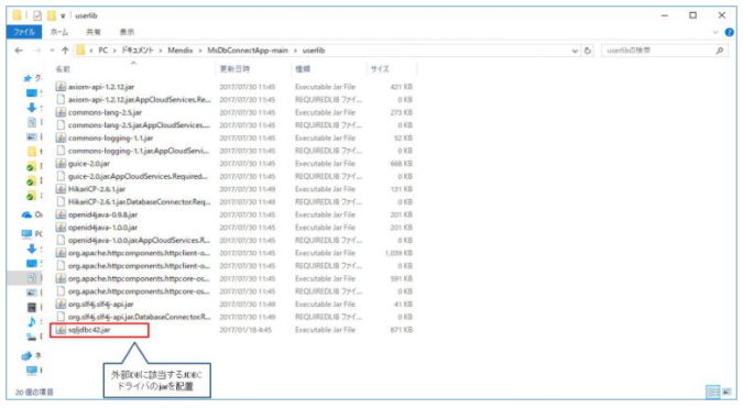 外部DBに該当するJDBCドライバを用意し、プロジェクトのuserlibフォルダ(※)に配置します。