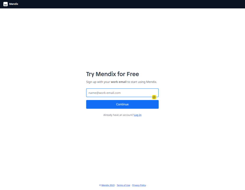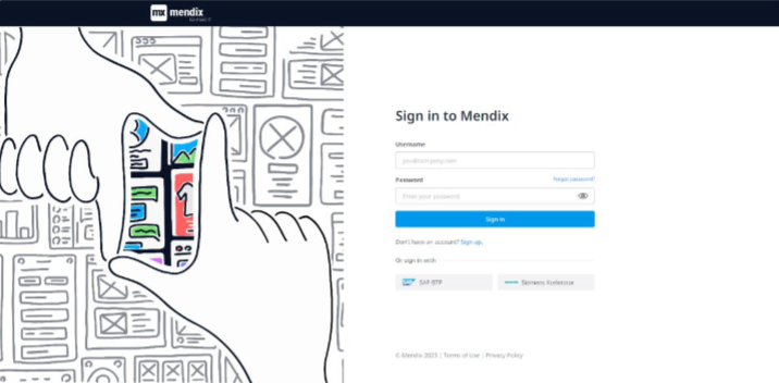 ⑥ ログイン画面に移行し、Mendixアカウントのメールアドレス、パスワードを入力しログイン