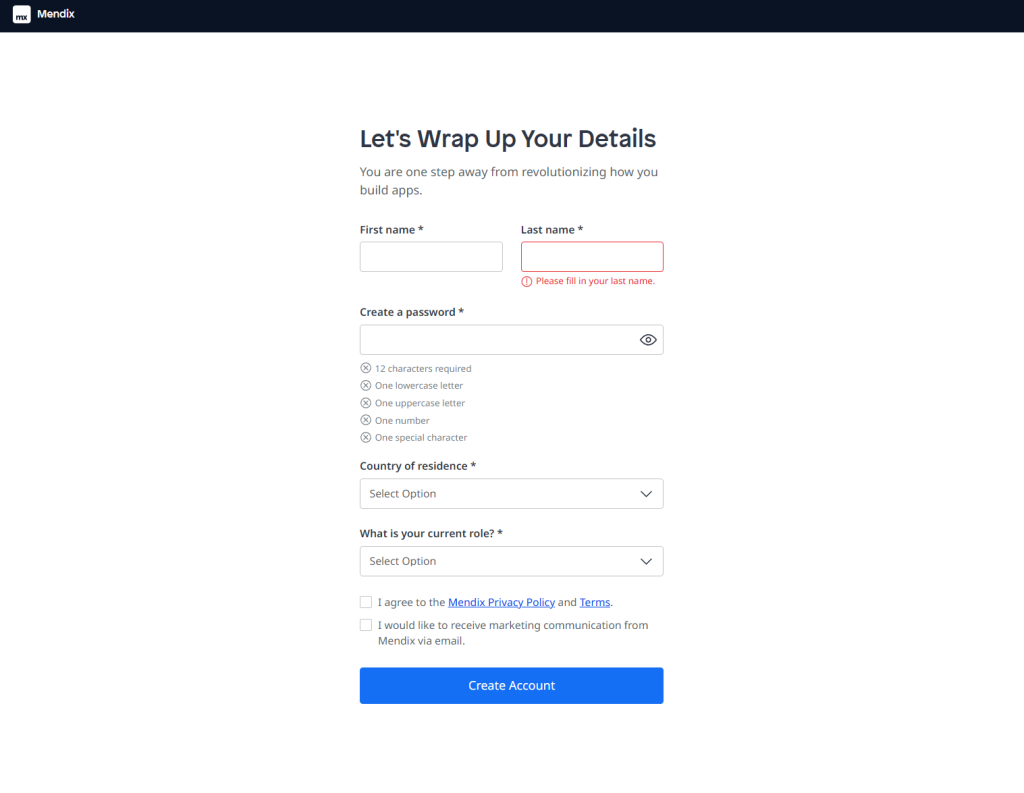 ③ 下記項目を入力し、Mendix Privacy PolicyとTermsをご確認の上、チェックをして「Create Account」ボタンをクリック