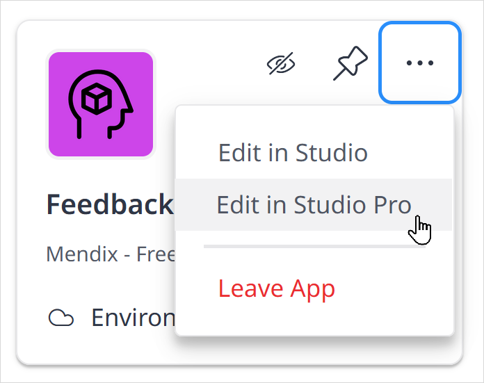 Studio は、[マイアプリ] ページのアプリタイルの省略記号(・・・) を使用してアプリを開くことができます。