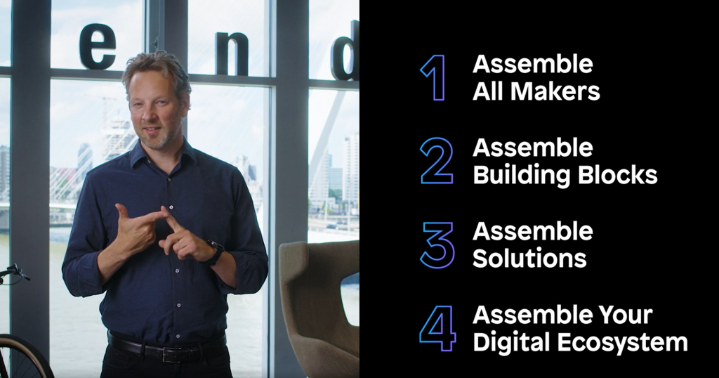 インダストリークラウドのデモが簡単に行われた後、Derekは再び戻ってきて、基調講演の主な4つのポイントを紹介しました。All Makersを集め、Building Blocksを集め、Solutionsを集め、Digital Ecosystemを集めましょう。