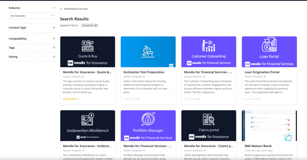 ここでDerekは、Time Series社の買収と、彼らがいかにして「業界で成功したテンプレートの素晴らしいライブラリ」を開発したかについて語っています。Time Series社の詳細については、こちらをご覧ください。その結果、Mendixはこれらのテンプレートのうち20種類をMarketplaceで提供することになりました。その範囲は、製造業向けのスマート・ウェアハウジング、プレディクティブ・メンテナンス、フィールド・サービス・プランニング、ワークプレイス・マネジメントなど多岐にわたります。さらに、KYC(Know Your Customer)、ポートフォリオ管理、信用格付け、見積・購入、クレーム管理など、銀行・保険業向けのテンプレートも用意されています。