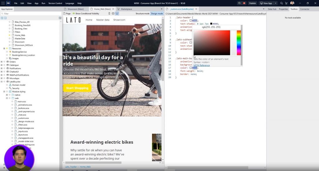 おそらく、Mendix Studio Proで最も価値のある追加機能の一つは、SCSSエディタの追加でしょう。これまでは、同様の結果を出すために、開発者は他に2つの外部APIを必要としていました。すべてがMendix Studioに凝縮されたことで、開発がより容易になることは間違いありません。デザインモードに入ると、開発者はリアルタイムで変更を確認することができ、さらにオートコンプリートも搭載されているので、より簡単に作業を進めることができます。