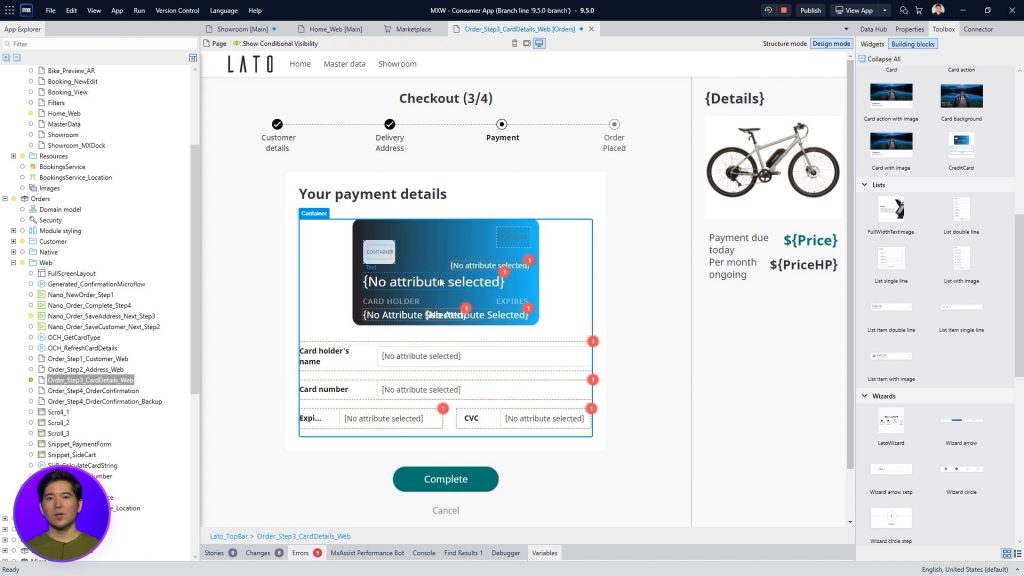 続いて Takuma は、複数のパラメータと任意の数のオブジェクトが存在する決済ページを構築する方法を紹介します。この例では、コネクタに搭載されたAIが検証式を作成し、マイクロフローで拡張できるようになっています。