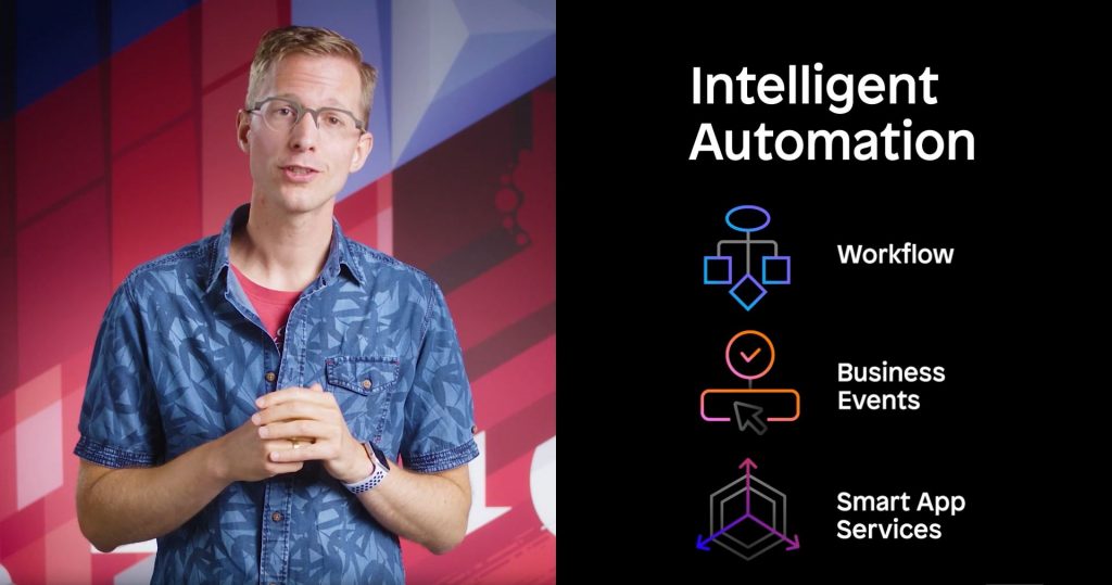 続いてJohanの話に戻り、彼はインテリジェント・オートメーションのコンセプトを紹介します。インテリジェント・オートメーションとは、ビジネス・イベントとワークフローを統合することです。Johanは、HR(Human Resources)のための新しいワークフローテンプレートの例として、休暇申請や購入申請など、マーケティング部門を効率化するものを紹介してくれました。