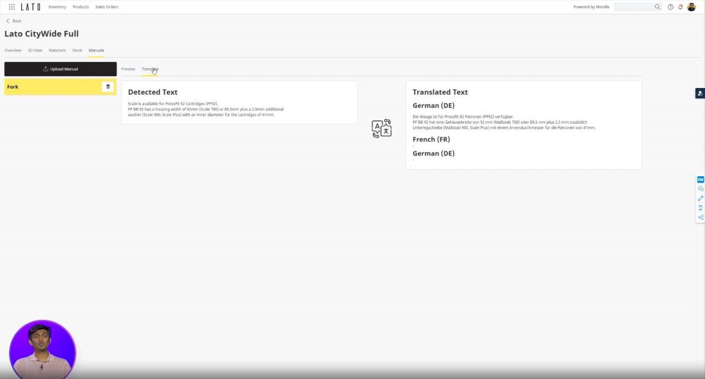 Viral氏は、このソリューションの一部として存在するもう一つのコネクタ、Intelligent Document Serviceも紹介しています。ここでは、アプリにアップロードされた自転車のマニュアルを、機械学習によって目的の言語に翻訳することができます。