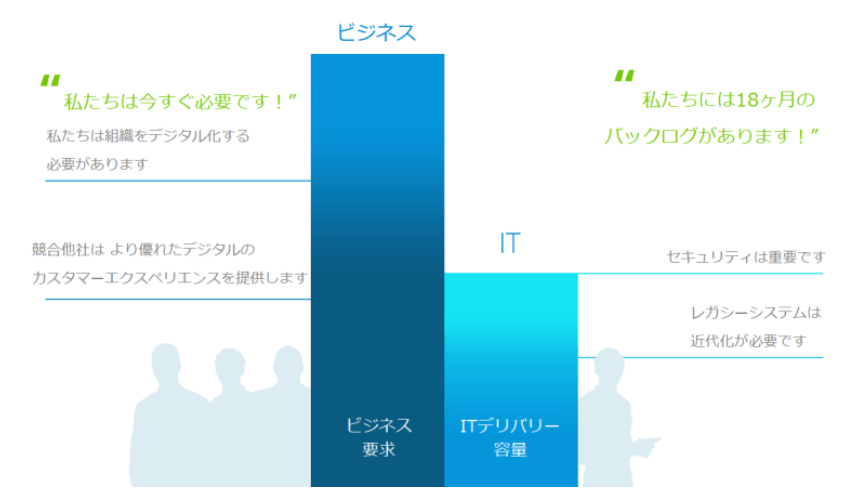 マーケティング、営業、人事、経営、財務など、社内のあらゆる部門がIT部門のリソースを奪い合っており、一方ではIT部門は多くのプロジェクトが遅れると言われて呼び出されていました。