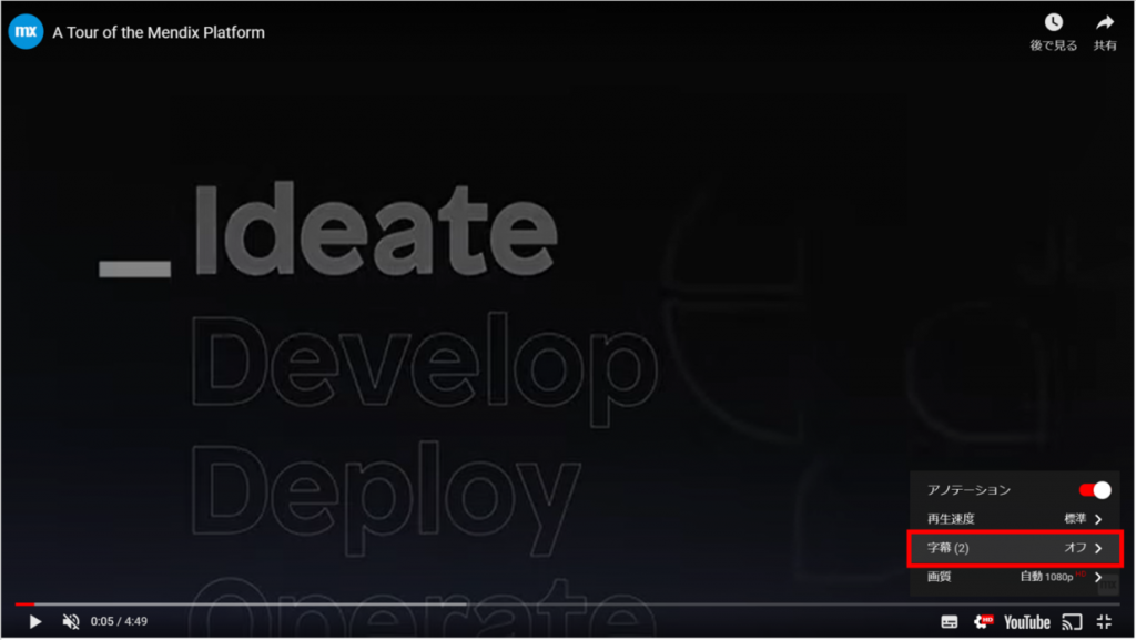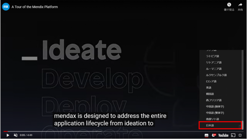- その後 「自動翻訳」から「日本語」を選択することで字幕が変更される