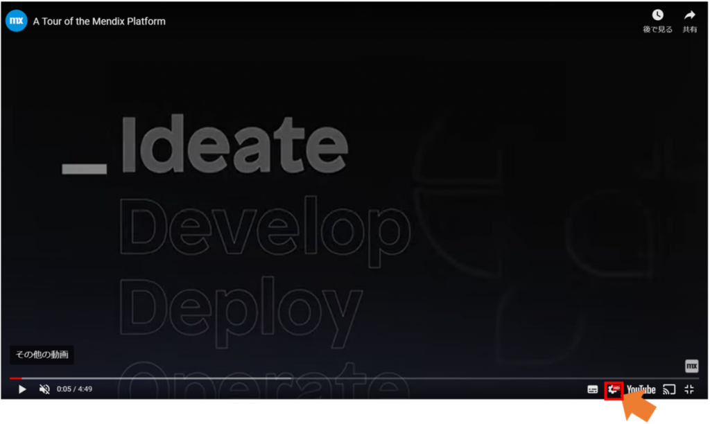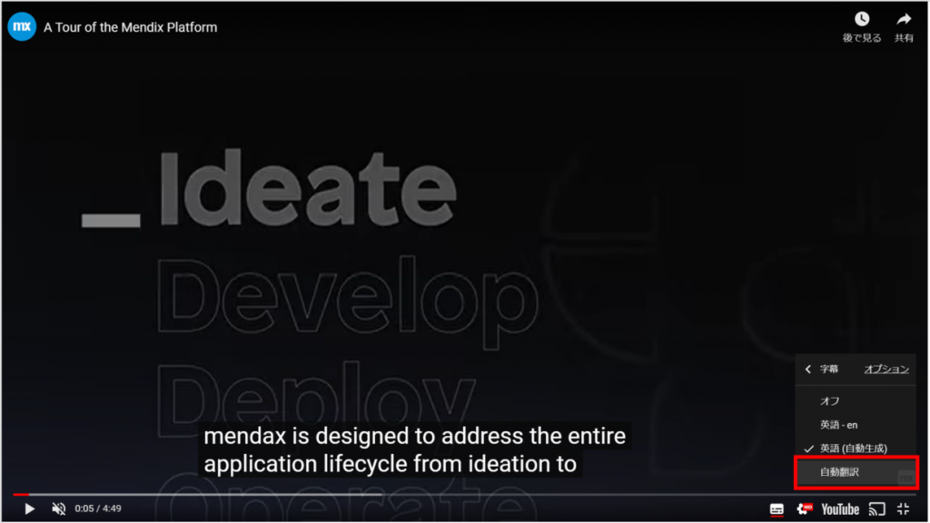 4.その後 「自動翻訳」から日本語を選択することで日本語の字幕が表示される
